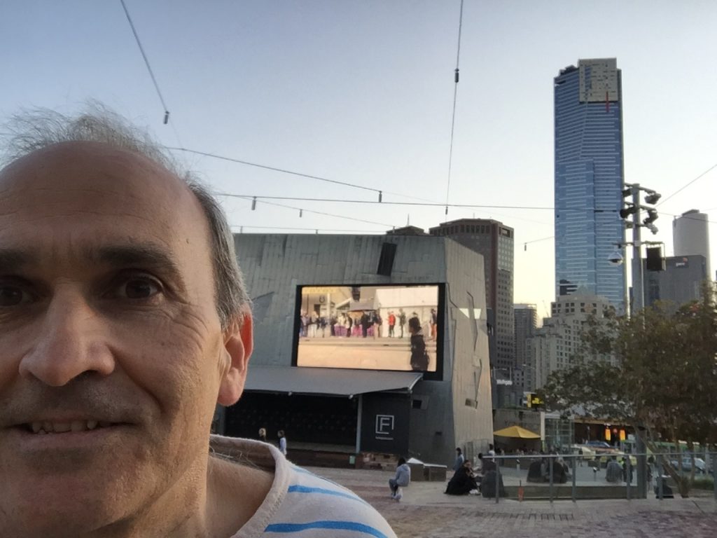 My recently completed short essay film about waiting in line, The Q, was on the big screen at Federation Square last night, as part of the 2015 Mobile Innovation Network Australasia [MINA] screenings. Not many queues in sight but the bars were full and the rain stayed away.